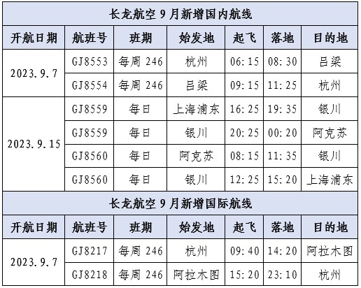 随着秋季的到来,许多地区迎来了一年当中最美的季节,长龙航空此次9月新增航线覆盖华北、西北、新疆、中亚国家等秋季出游热门目的地,给旅客们提供更加多样的出行选择。同时,随着杭州第19届亚运会的临近,各地旅客到杭州观看亚运赛事的需求也更加旺盛,此次新增的杭州=吕梁、杭州=阿拉木图航线,也将纳入到长龙航空亚运航班,以满足国内外旅客在亚运期间的出行需求。