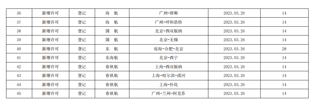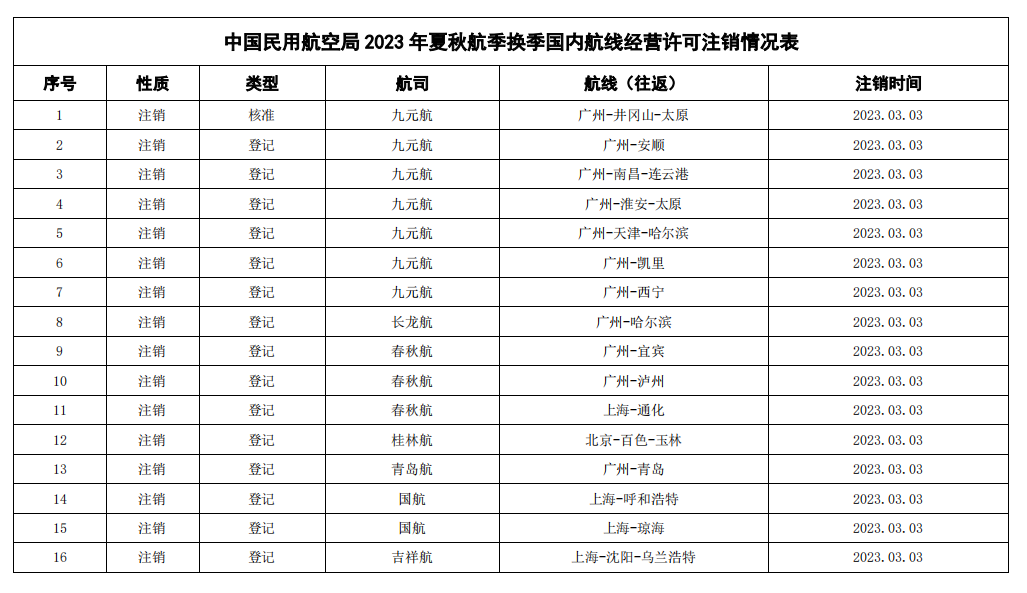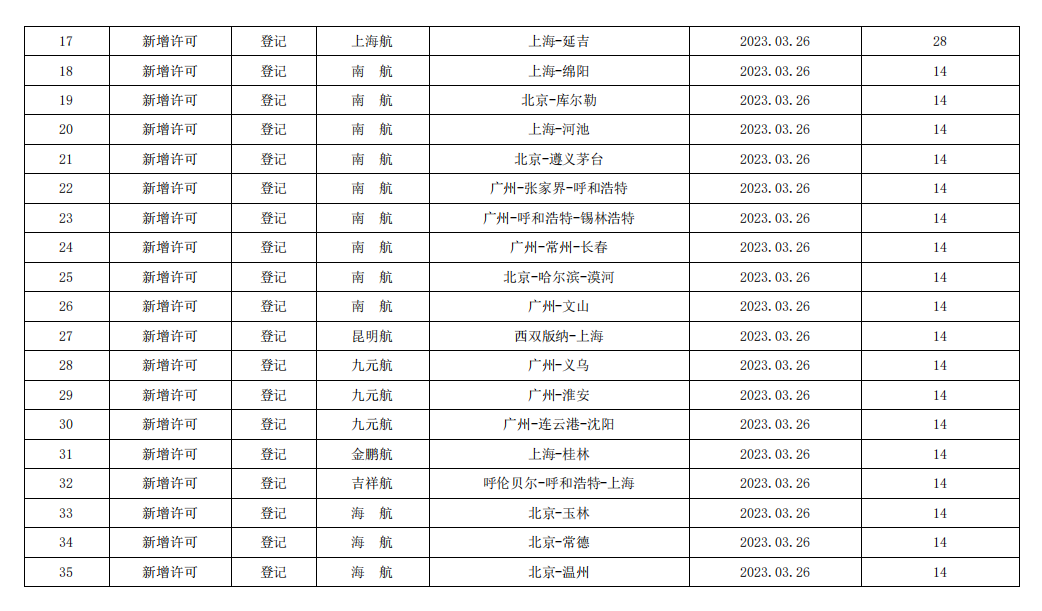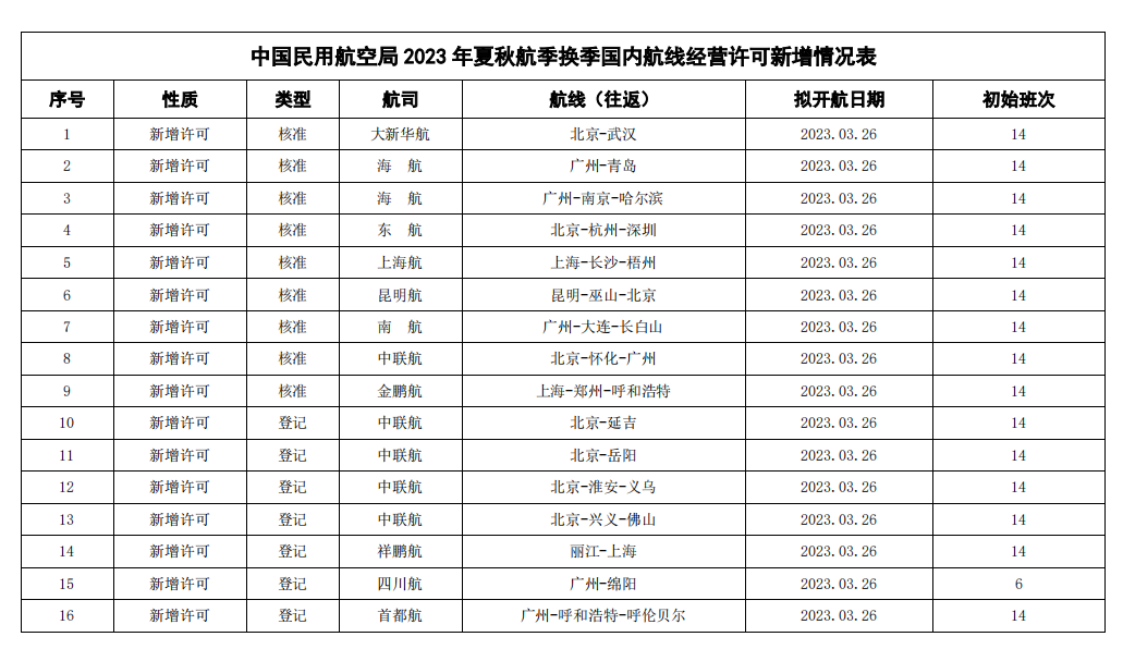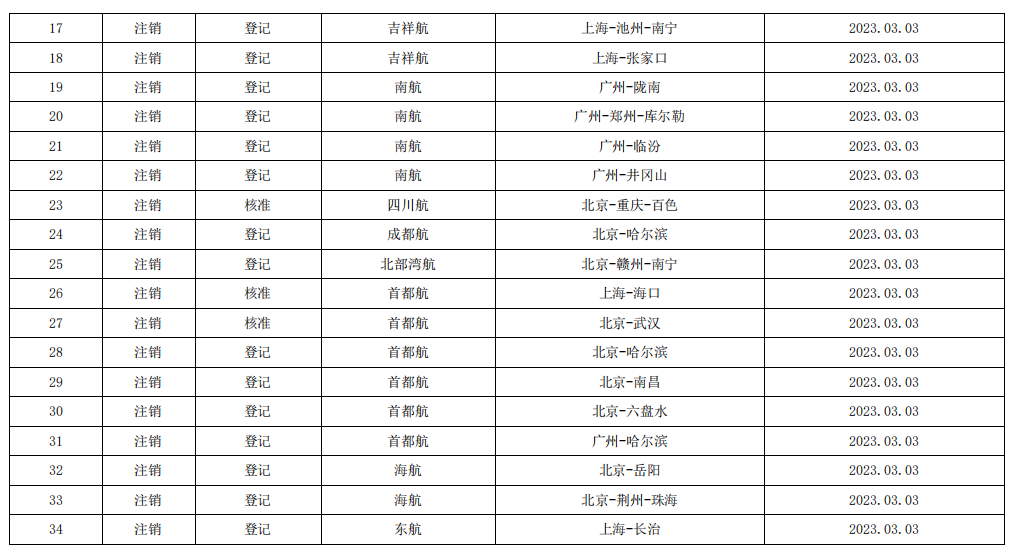 民航局发布2023年夏秋航季换季颁发、注销国内航线经营许可信息通告。数据显示,2023年夏秋航季新增航线45条,注销航线34条。