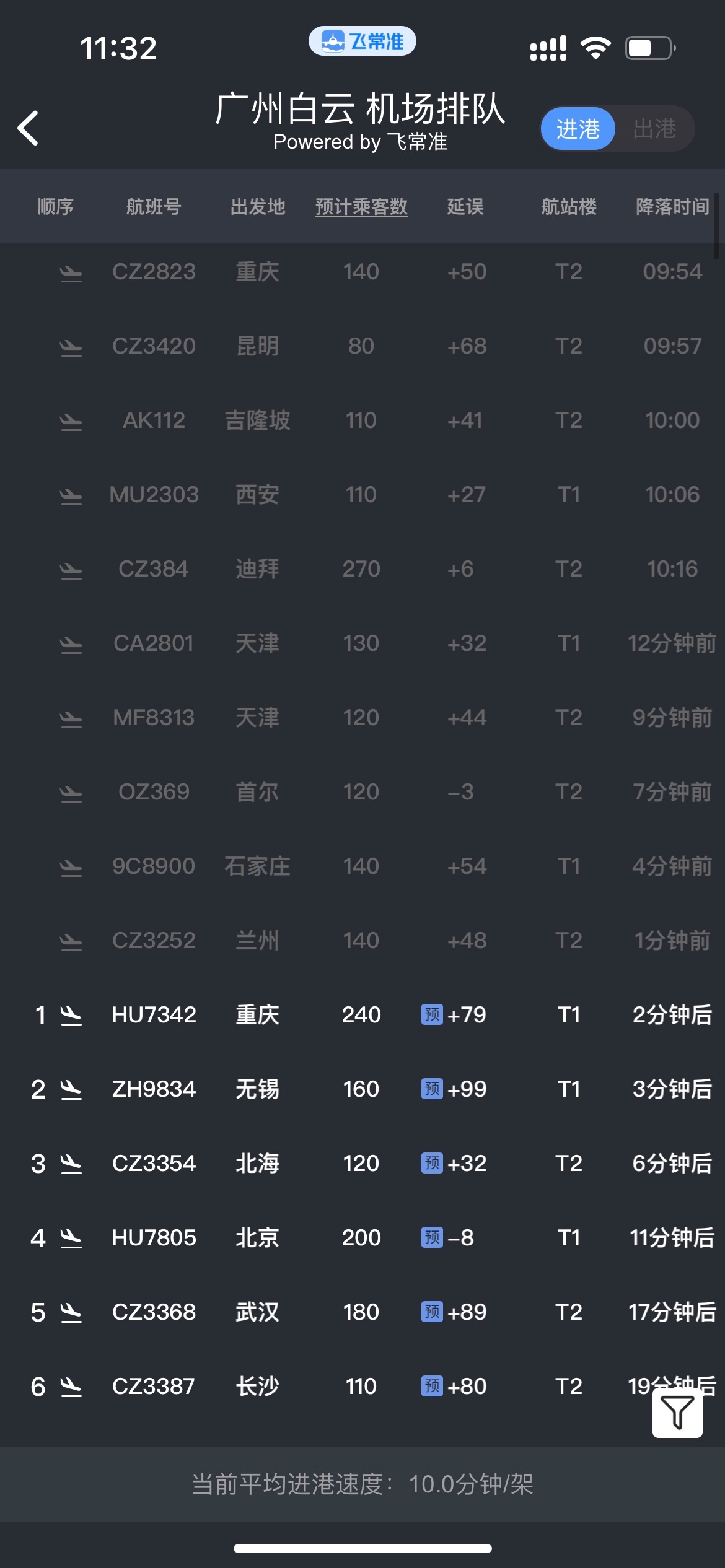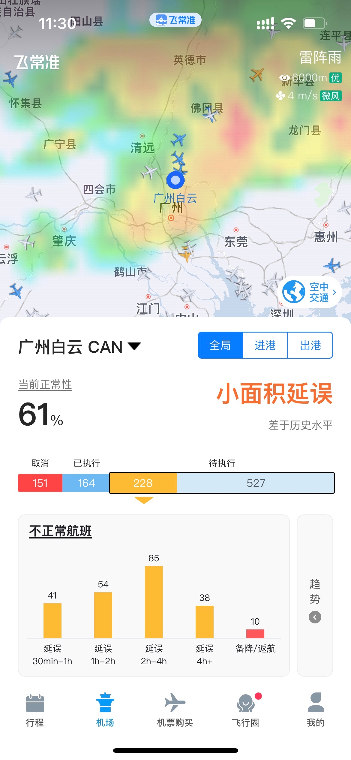 据飞常准APP显示,截至3月24日11:30,受恶劣天气影响,广州白云机场部分航班受影响,延误2h以上进出港航班超百余架次,延误4h以上进出港航班38架次。出现1小时内无航班进港情况。当前广州白云机场进港航班已开始逐步恢复。