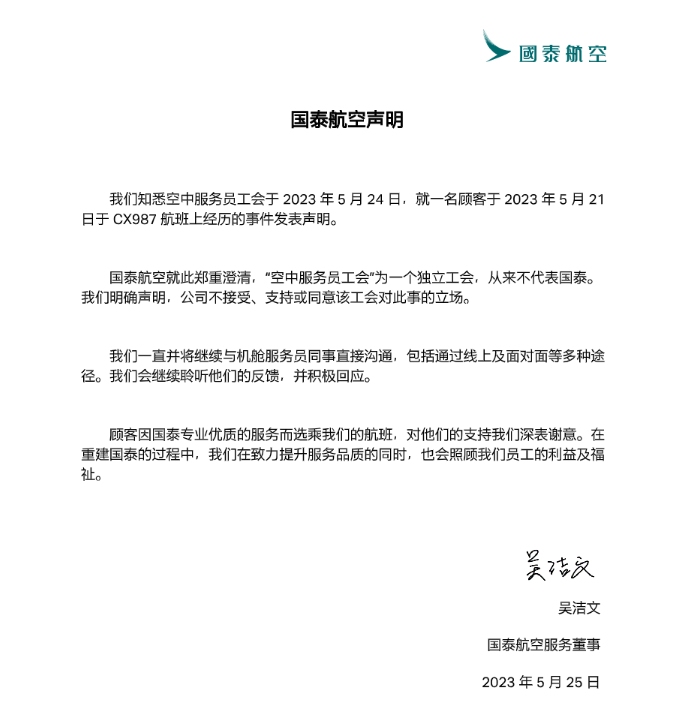 国泰航空服务董事吴洁文表示:我们知悉空中服务员工会于2023年5月24日,就一名顾客于2023年5月21日于CX987航班上经历的事件发表声明。