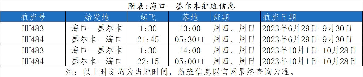 据悉,海南航空海口-墨尔本航线计划每周四、周日执行2个往返航班,采用空客A330宽体客机执飞。6月29日-9月30日:去程计划凌晨1:30从海口起飞,13:00到达墨尔本;返程计划21:45起飞,次日5:30到达海口。10月1日-10月28日:去程计划凌晨1:30从海口起飞,14:00到达墨尔本;返程计划22:15起飞,次日5:00到达海口。以上航班时刻均为当地时间,航班信息请以实际查询为准。
