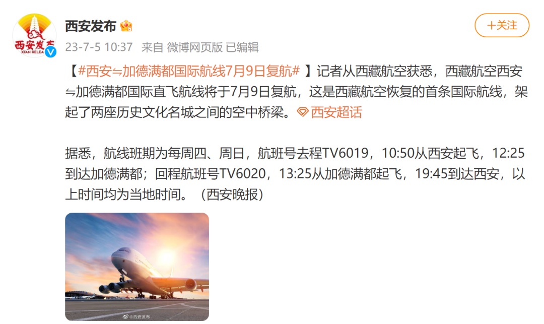 从西藏航空获悉,西藏航空西安⇋加德满都国际直飞航线将于7月9日复航,这是西藏航空恢复的首条国际航线,架起了两座历史文化名城之间的空中桥梁。