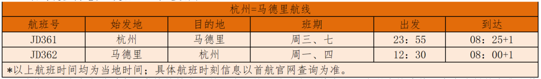 此次计划新开杭州=马德里航线使用A330执飞,每周两班。根据航班计划,杭州=马德里航线去程航班号JD361,将于23:55从杭州起飞,西班牙当地时间次日8:25飞抵马德里;回程JD362航班计划于西班牙当地时间12:30自马德里离港, 次日8:00落地杭州。