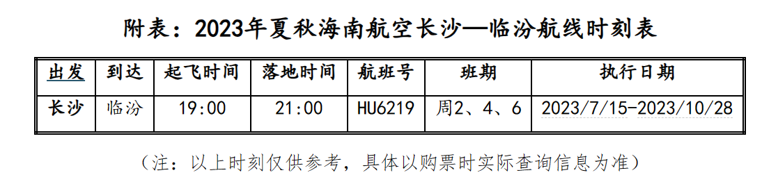 7月15日起,海南航空将开通长沙—临汾航线,航班号为HU6219/6220,每周二、四、六各执飞1个往返,19:00从长沙黄花国际机场起飞,21:00到达临汾尧都机场;22:00从临汾起飞,次日00:10降落长沙。