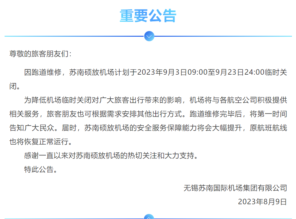 苏南硕放机场发布公告,因跑道维修,苏南硕放机场计划于2023年9月3日09:00至9月23日24:00临时关闭。