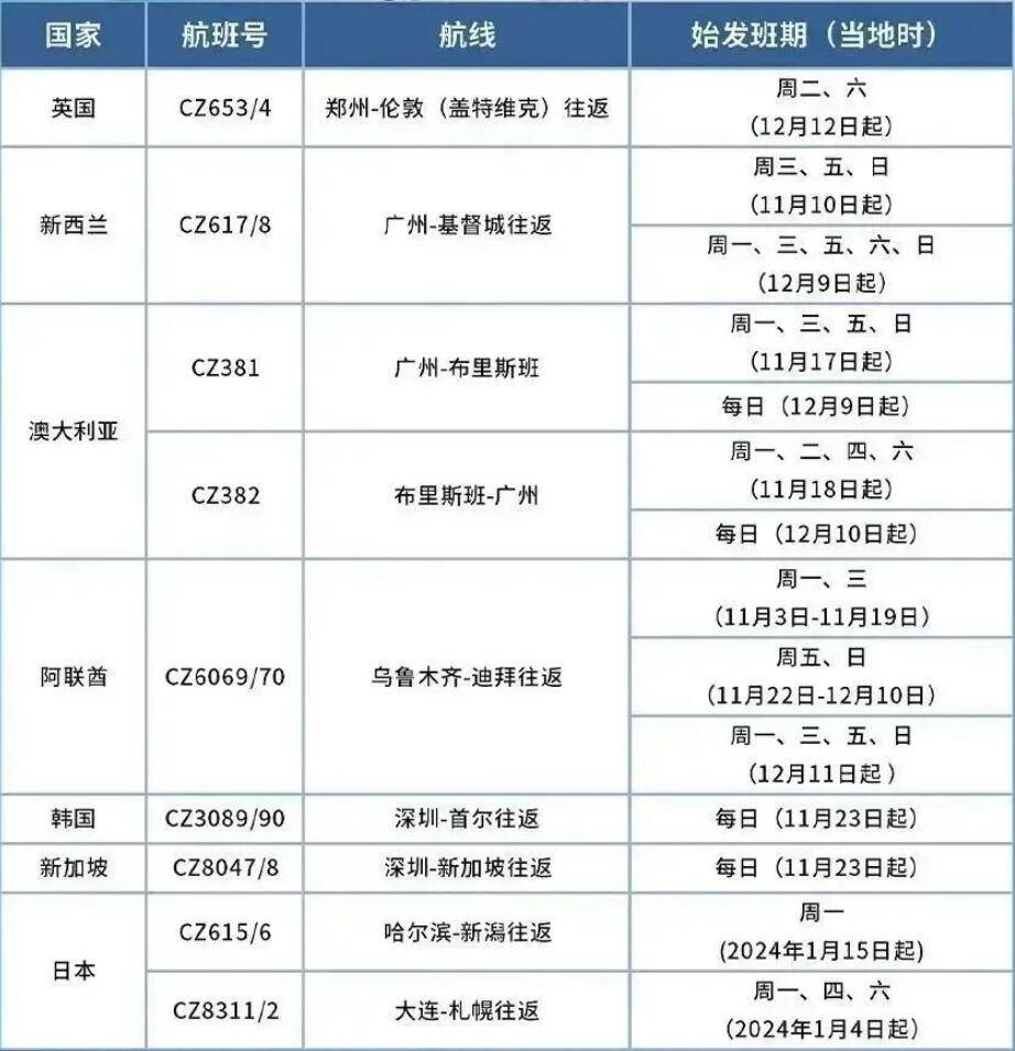 自2023.10.29至2024.3.30,南航正式执行冬春航季航班计划,计划执行航班46万班次,日均航班量超3000班次,通航点将增至235个,具体如下: