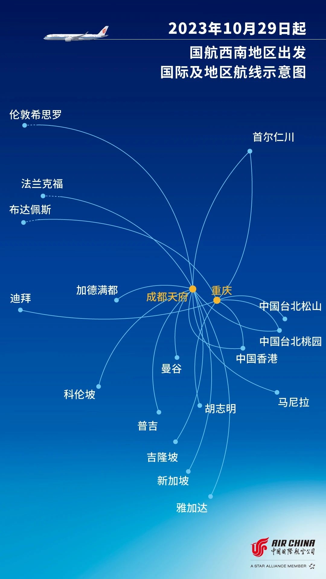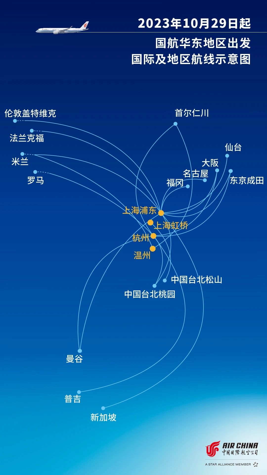 2023-2024年冬春航季,国航将加大华东地区至日本航线、西南地区出发国际及地区航线的运力投入:上海-东京将增至每天4班,杭州-东京将增至每周4班,并恢复上海-名古屋、上海-仙台航线;同时成都天府-吉隆坡航线将增至每周5班,成都天府-科伦坡航线将增至每周4班,航线示意图如下: