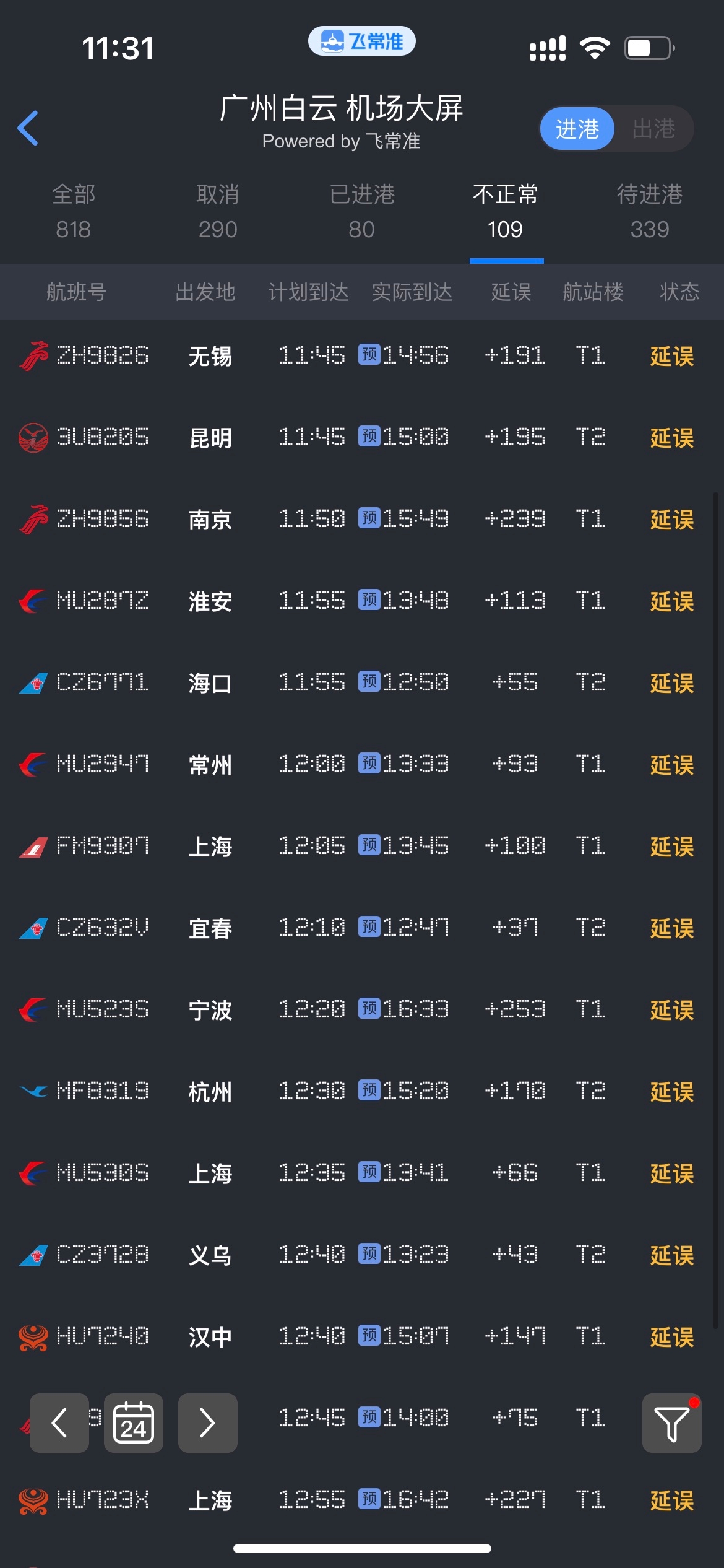 据飞常准APP显示,截至3月24日11:30,受恶劣天气影响,广州白云机场部分航班受影响,延误2h以上进出港航班超百余架次,延误4h以上进出港航班38架次。出现1小时内无航班进港情况。当前广州白云机场进港航班已开始逐步恢复。