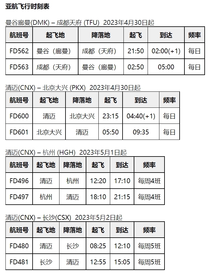 4月5日消息:亚洲航空继续恢复其历史航班,第二季度开始游客前往泰国将有更多的选择。这次亚航将恢复4条直飞泰国的航线,分别是曼谷(廊曼)-成都(每周7班)、清迈-北京(每周7班)、清迈-杭州(每周4班)和清迈-长沙(每周5班)。这些航线将于2023年4月30日开始陆续投入运营。