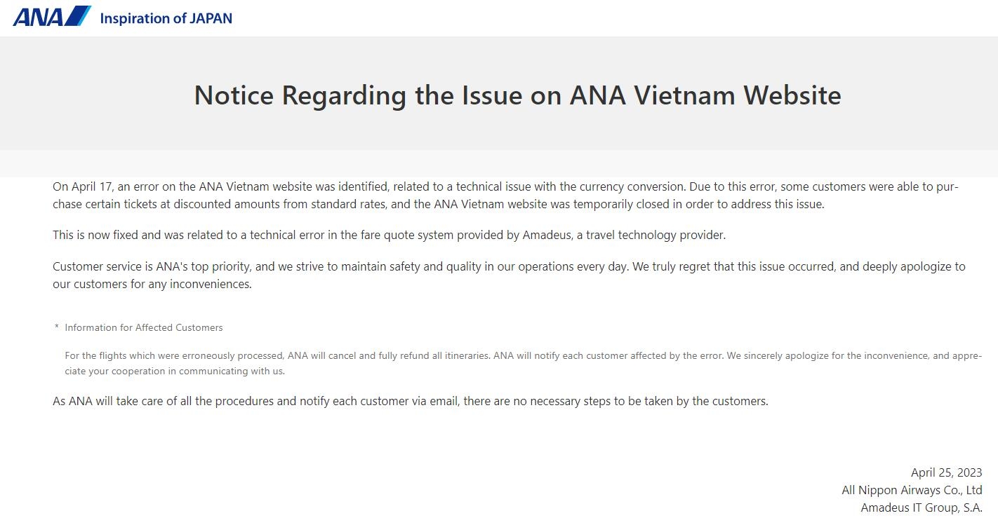 今日,ANA首次官方正式作出回应,由于汇兑问题,导致了错误票价问题。同时,ANA在官网发公告表示:“对于错误处理的航班,全日空将会取消并全额退还。同时,全日空还将会通知每个受此错误处理影响的客户。”