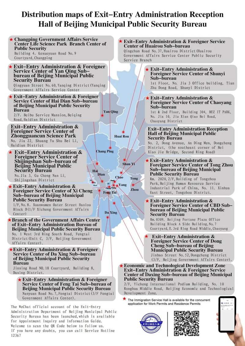 此次增设后,北京市外国人“两证联办”服务场所达到15个,分别位于东城区、西城区、朝阳区、海淀区、丰台区、石景山、通州区、顺义区、昌平区、大兴区、怀柔区和延庆区等12个区。