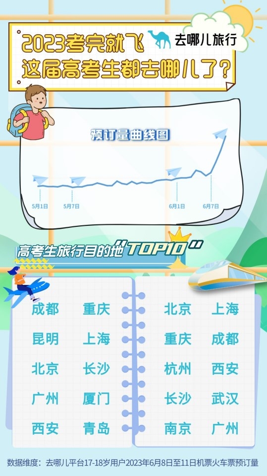 6月10日下午,随着最后一门考试结束,2023年全国高考正式落下帷幕。许多考生选择用一场毕业旅,结束自己的高中生涯。去哪儿大数据显示,6月9日至6月12日,去哪儿平台上17-18岁人群机票预订量显著增长,机票预订量环比上一周增长3倍。热门目的地为成都、重庆、昆明、上海、北京、长沙、广州、厦门、西安、青岛、杭州、海口、三亚。