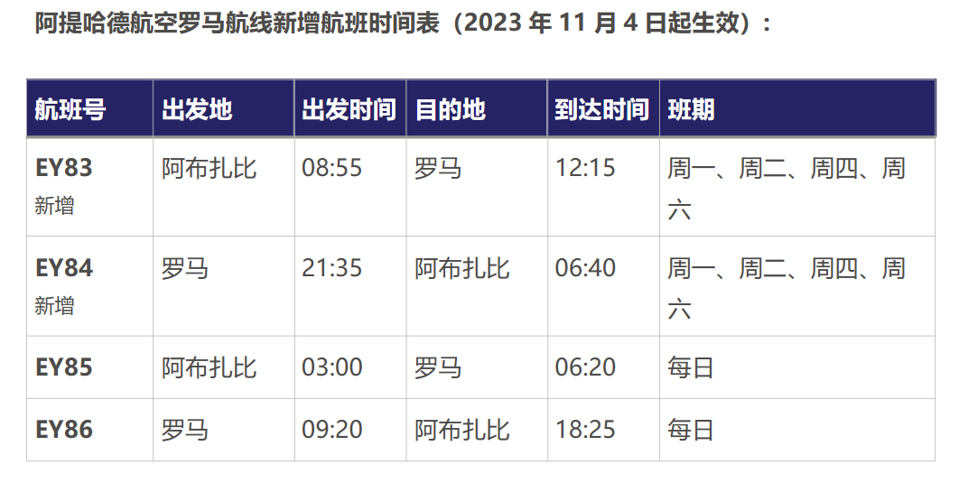 自2023年11月4日起,新增的四班客运航班将为商务和休闲旅客提供更便捷的出行方式,通过周一、周二、周四和周六的每日双程航班,更好地连接意大利和阿联酋的首都。